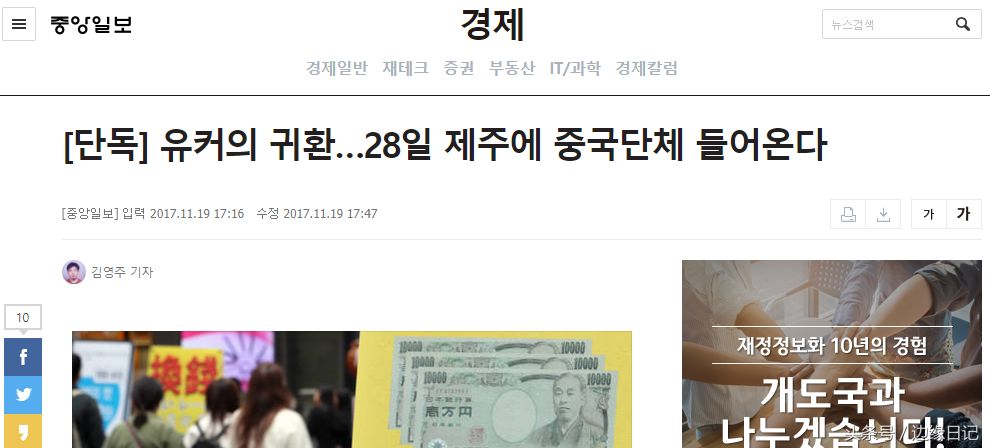 当地时间11月19日,韩国《中央日报》报道,本月28日将由25人组成的上海旅行团访问韩国济州岛。这也意味着“关系回暖”后,韩国吸引中国游客的一系列政策开始奏效。