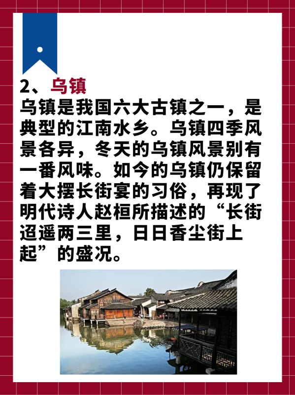 乌镇是我国六大古镇之一,是典型的江南水乡。乌镇四季风景各异,冬天的乌镇风景别有一番风味。再现了明代诗人赵桓所描述的“长街迢遥两三里,日日香尘街上起”的盛况。