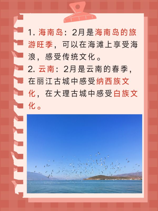 以上仅是一些适合2月旅游的目的地,您可以根据自己的兴趣和偏好选择其他目的地。无论您选择哪个目的地,都建议您提前做好旅游计划,以确保您的旅行顺利和愉快。