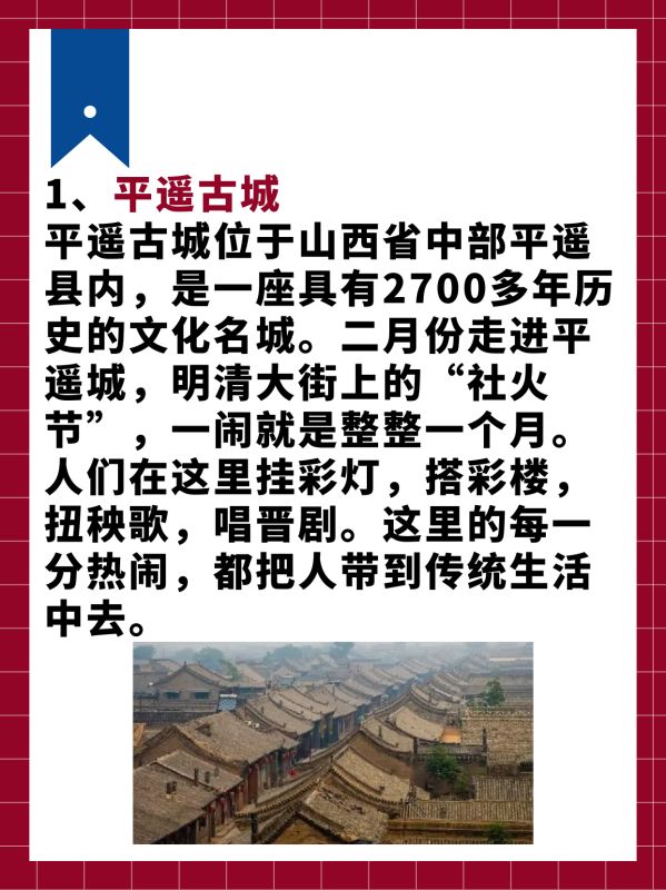 平遥古城位于山西省中部平遥县内,是一座具有2700多年历史的文化名城。二月份走进平遥城,明清大街上的“社火节”,一闹就是整整一个月。