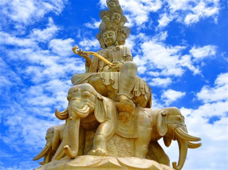十方普贤圣像是一座通高48米,总重量达660吨的铜铸镏金工艺佛像造像,由台座和十方普贤像组成。普贤的十个头像分为三层,代表了世人的十种心态。圣像内为484平方米的佛中殿,供奉阿弥陀佛铜像,四周绕汉白玉雕佛像。“十方”一是意喻普贤的十大行愿,二是意喻普贤无边的行愿能圆满十方三世诸佛和芸芸众生。 山顶即使是七八月份也会很冷,上山需要带件外套,但是七八月份是不需要租军大衣的,大家不要被骗。