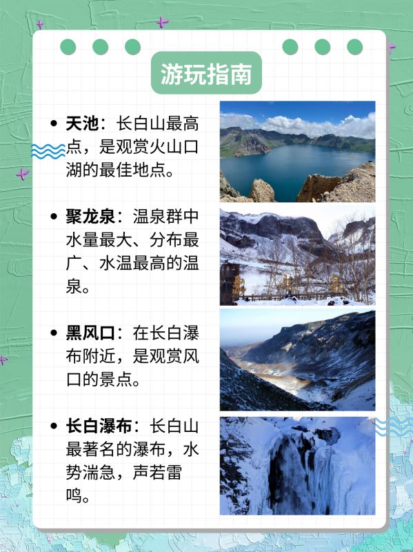 注意事项:长白山地势险峻,游客在游览时要注意安全,遵守规定。同时,保护环境也是重要的,不乱扔垃圾,保持景区的整洁。