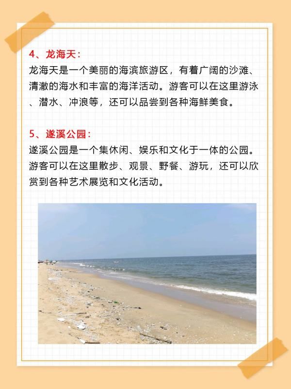 龙海天是一个美丽的海滨旅游区,有着广阔的沙滩、清澈的海水和丰富的海洋活动。游客可以在这里游泳、潜水、冲浪等,还可以品尝到各种海鲜美食。