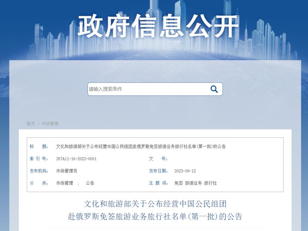 根据《中华人民共和国政府和俄罗斯联邦政府关于互免团体旅游签证的协定》相关规定,经中俄双方友好协商,文化和旅游部将经营中国公民组团赴俄罗斯免签旅游业务旅行社名单(第一批)予以公布。