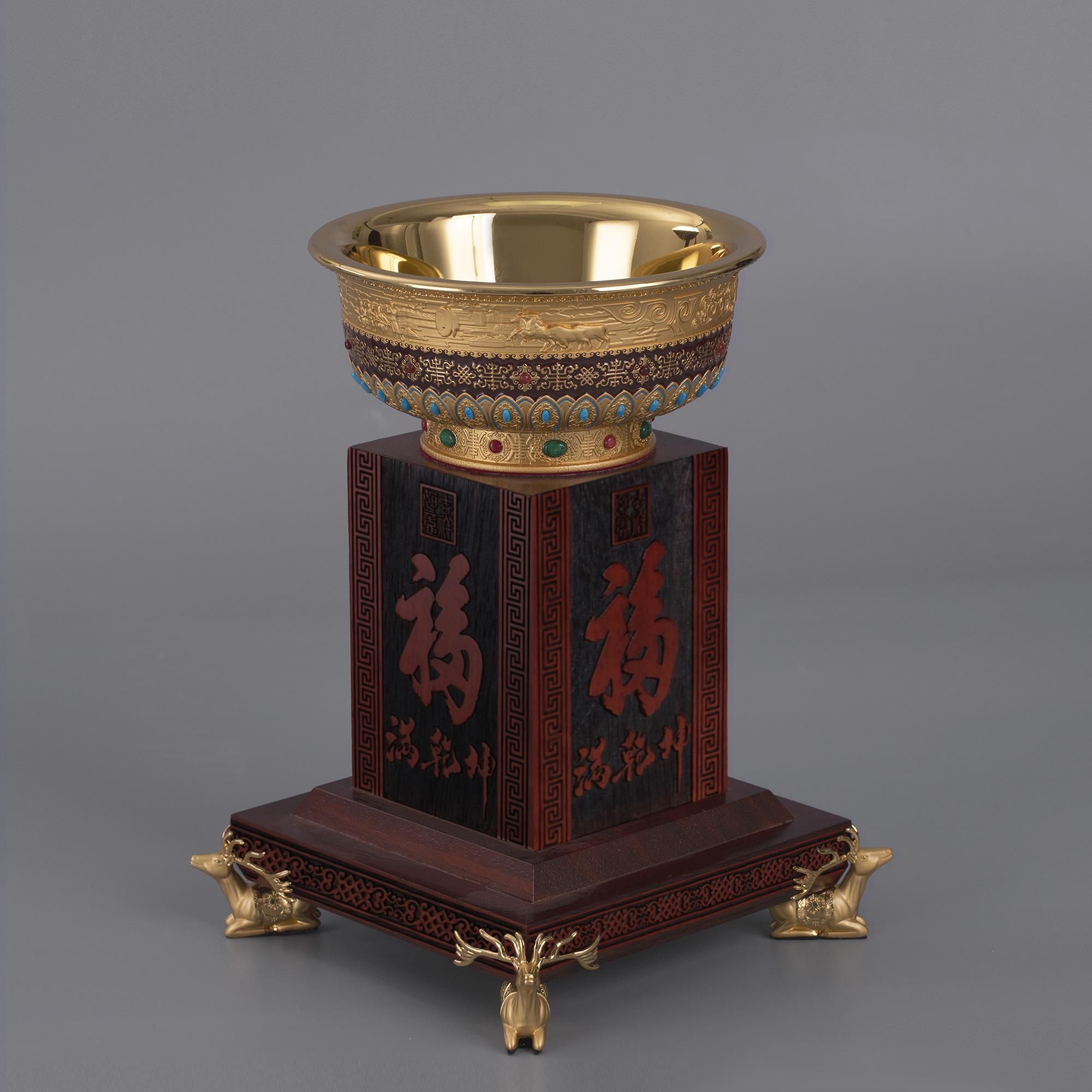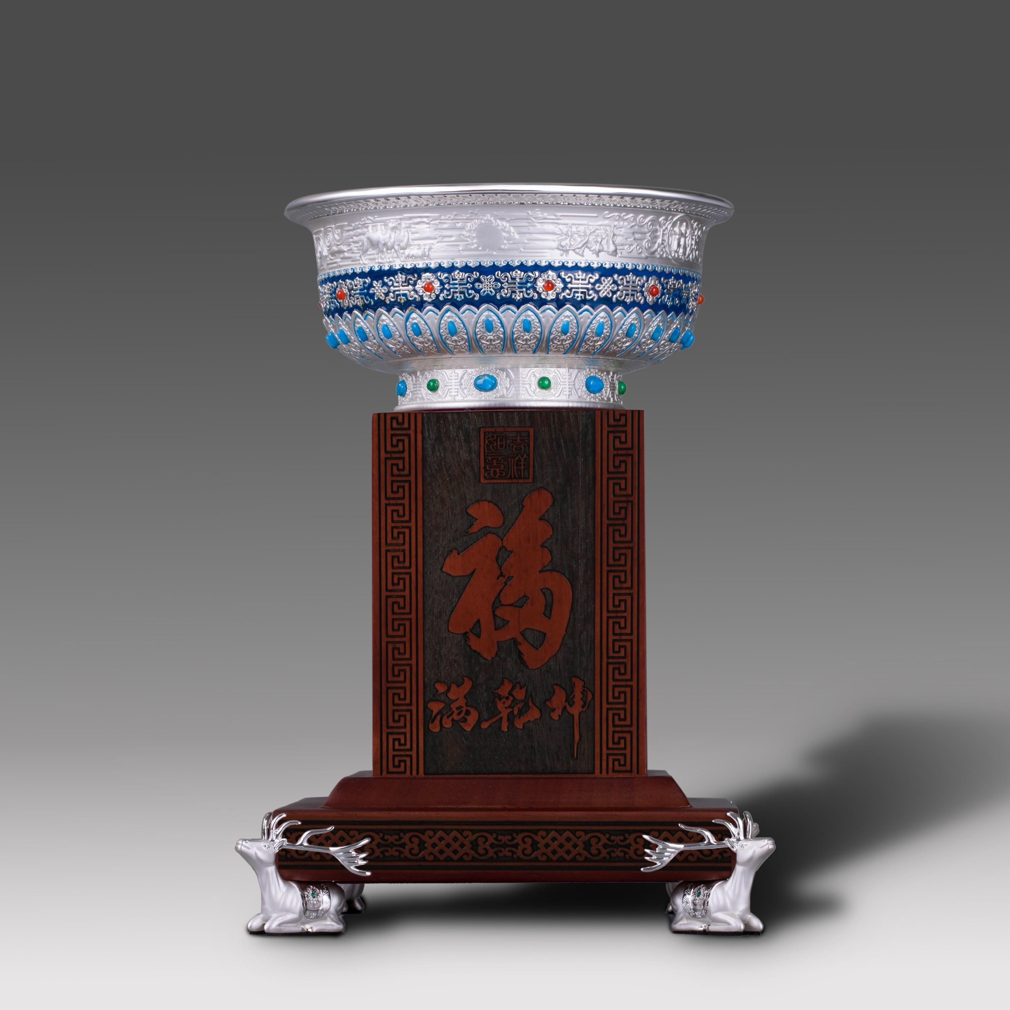 蒙古族的大汗金碗就是典型的例子,他源于成吉思汗黄金家族接风洗尘、饮酒使用的金碗为艺术创作来源。它是地位、财富和权利的象征,反映了蒙古民族的典章制度和艺术才华,具有浓郁的草原游牧文化特色。作品在原有设计中加入新的设计理念,利用现代化技术和材料,在不失传统文化的同时符合当代人们的审美。荣朝在不断地创新、兼容,只有这样才能使我们的蒙元文化传播出去,让更多的人熟知蒙古历史。