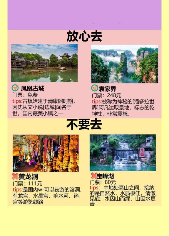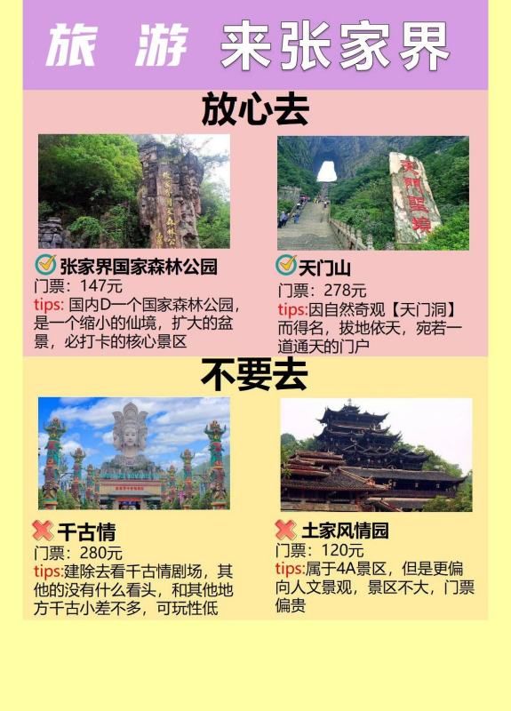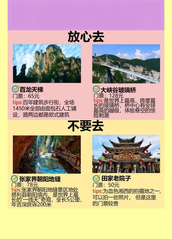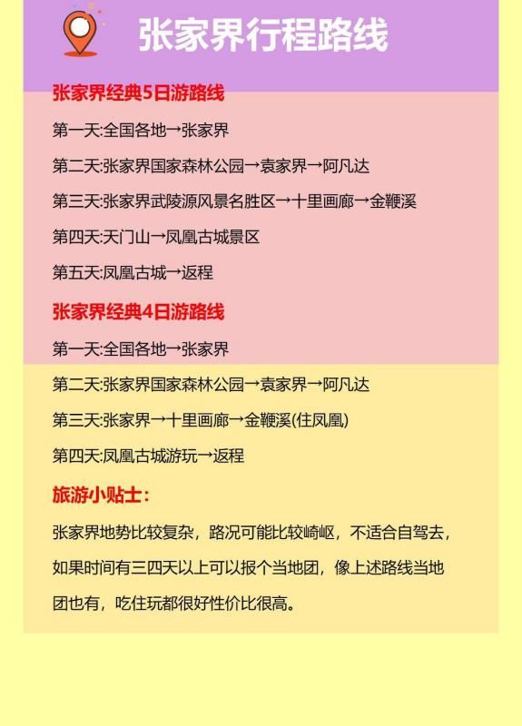 张家界地势比较复杂,路况可能比较崎岖,不适合自驾去,如果时间有三四天以上可以报个当地团,像上述路线当地团也有,吃住玩都很好性价比很高。