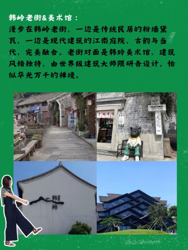 漫步在韩岭老街,一边是传统民居的粉墙黛瓦,一边是现代建筑的江南庭院,古韵与当代,完美融合。老街对面是韩玲美术馆,建筑风格独特,由世界级建筑大师隈研吾设计,恰似华光万千的禅境。