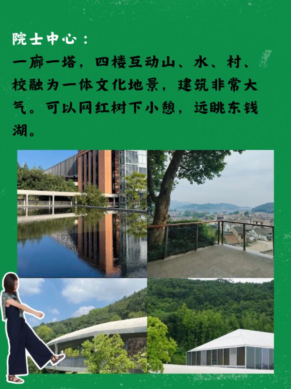 一廊一塔,四楼互动山、水、村、校融为一体文化地景,建筑非常大气。可以网红树下小憩,远眺东钱湖。