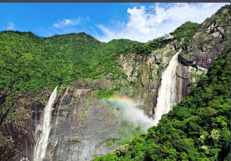 景区内岱仙瀑布总落差约314米,单级落差184米,雄伟壮观,被誉为“华东第一瀑”。晴天,阳光直射,水帘发光,彩虹若隐若现,似巨幅珠帘下垂,像彩绸飞舞,蔚为壮观。