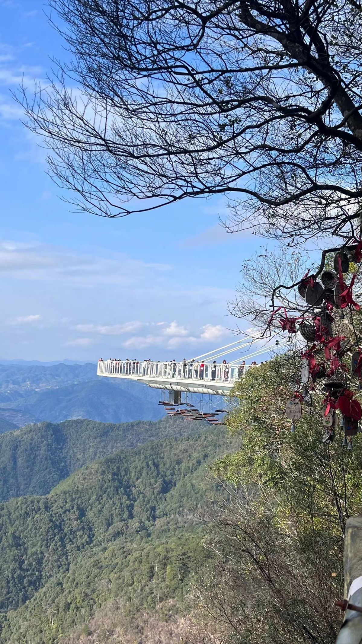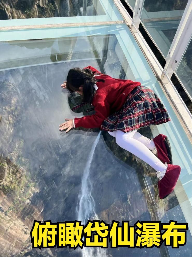 瀑布斜上方是新建设的玻璃观景台——天空之心,站在上面可俯瞰岱仙瀑布全景,有“人在空中走,景在脚下游”的美妙体验。这座悬空高度达314米的观景台位于岱仙瀑布斜上方,外挑悬空长度约52米,面积520平方米。