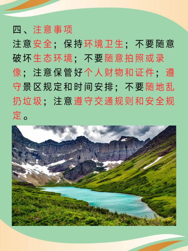 6. 游客在游览过程中请遵守景区规定和时间安排,不要迟到或早退。
