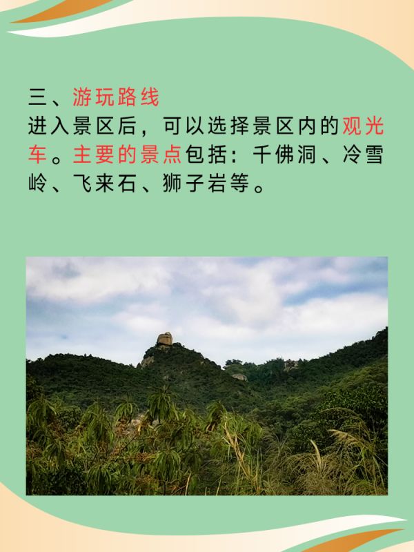 进入螺髻山景区后,可以选择乘坐景区内的观光车游览各个景点。主要的景点包括:千佛洞、冷雪岭、飞来石、狮子岩等。每个景点都有详细的介绍和导览图,方便游客了解各个景点的特色和历史文化背景。