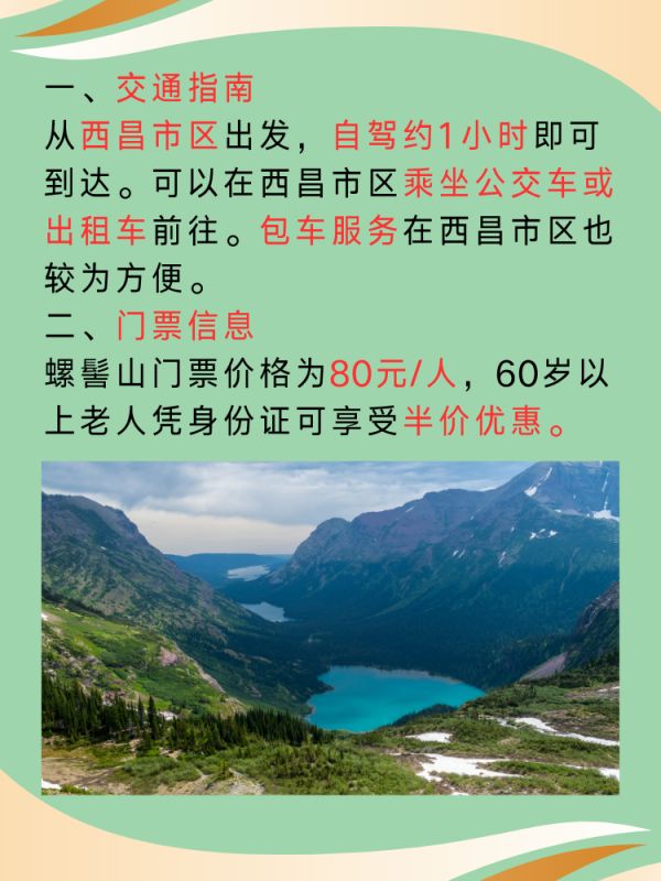 螺髻山门票价格为80元/人,60岁以上老人凭身份证可享受半价优惠。门票包含景区内的所有景点,无需额外购买。
