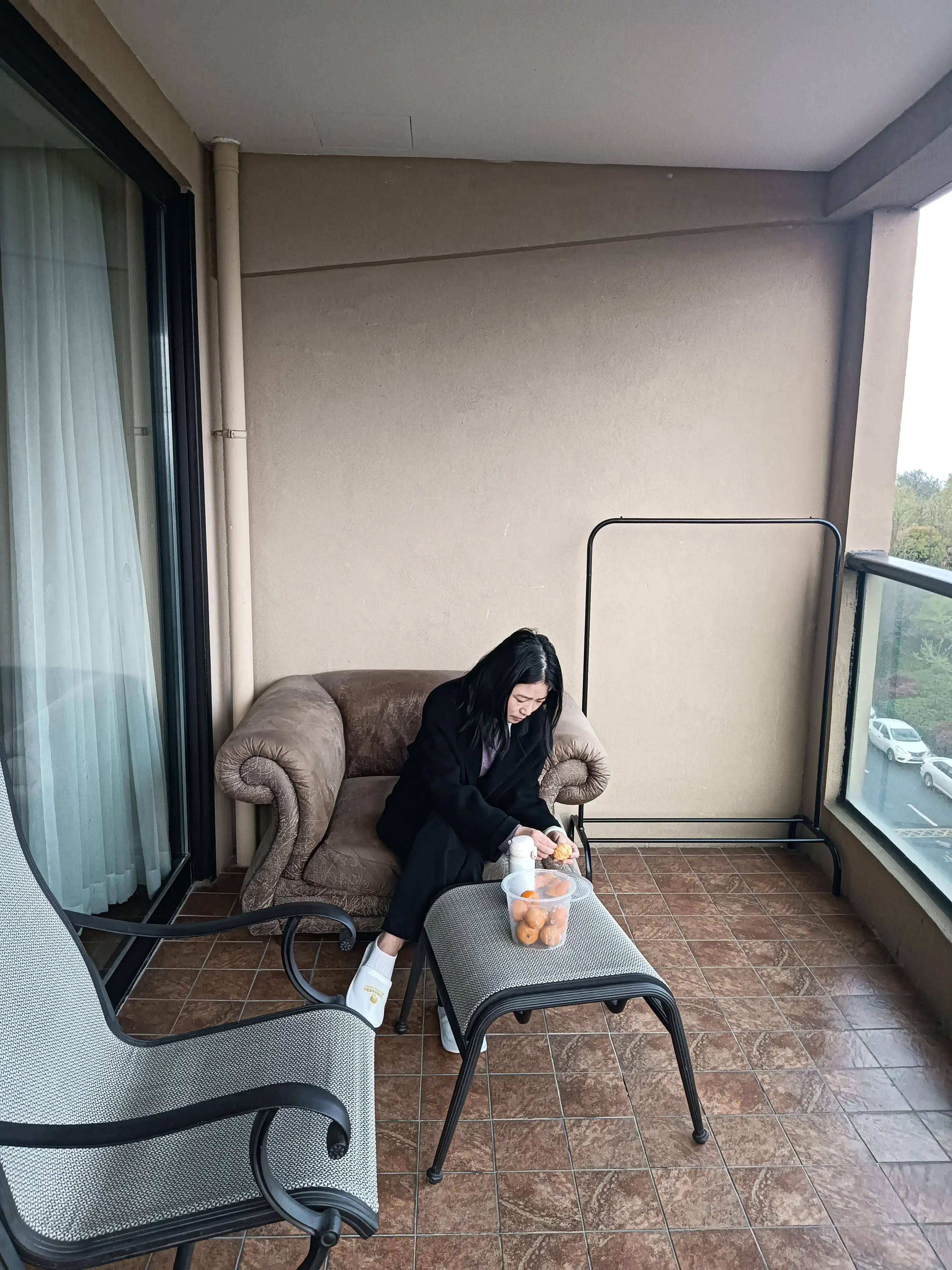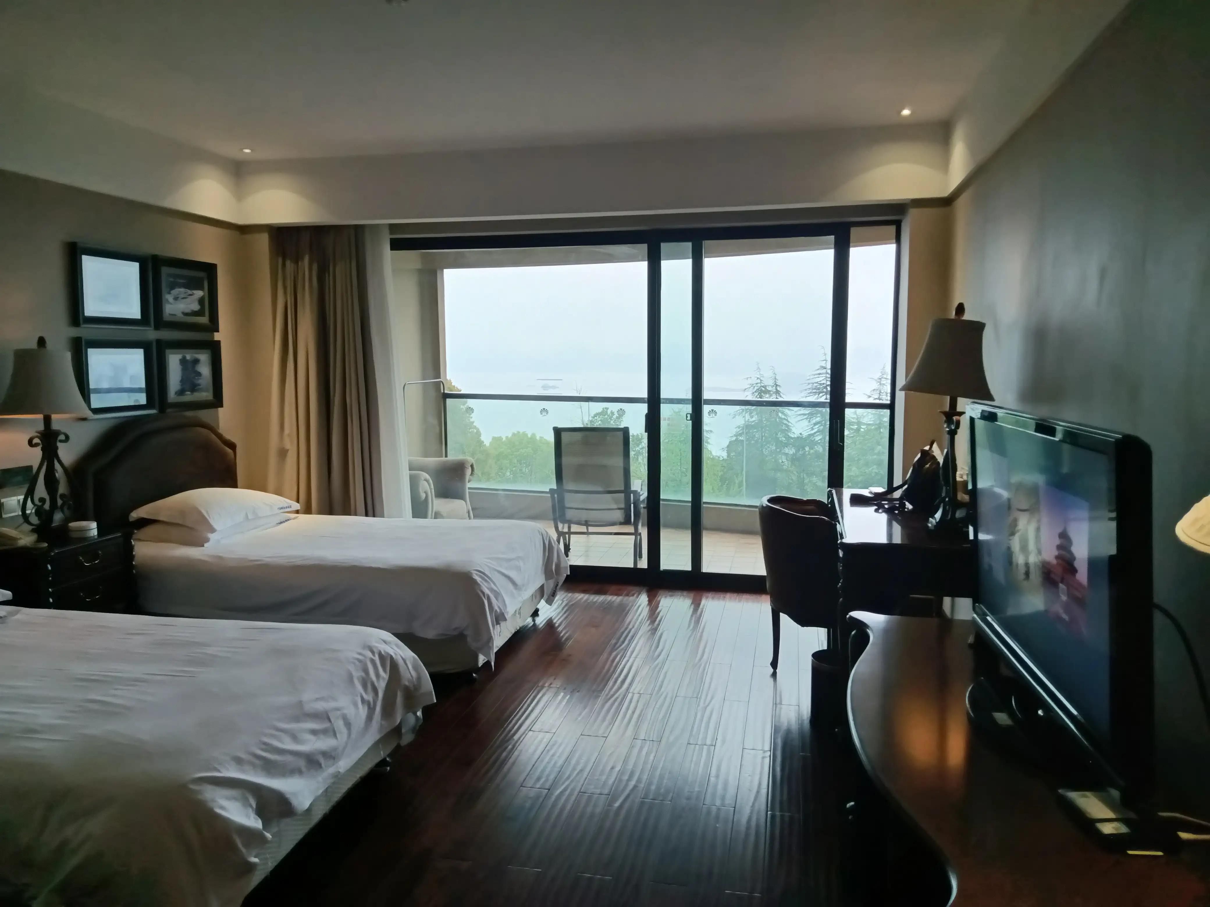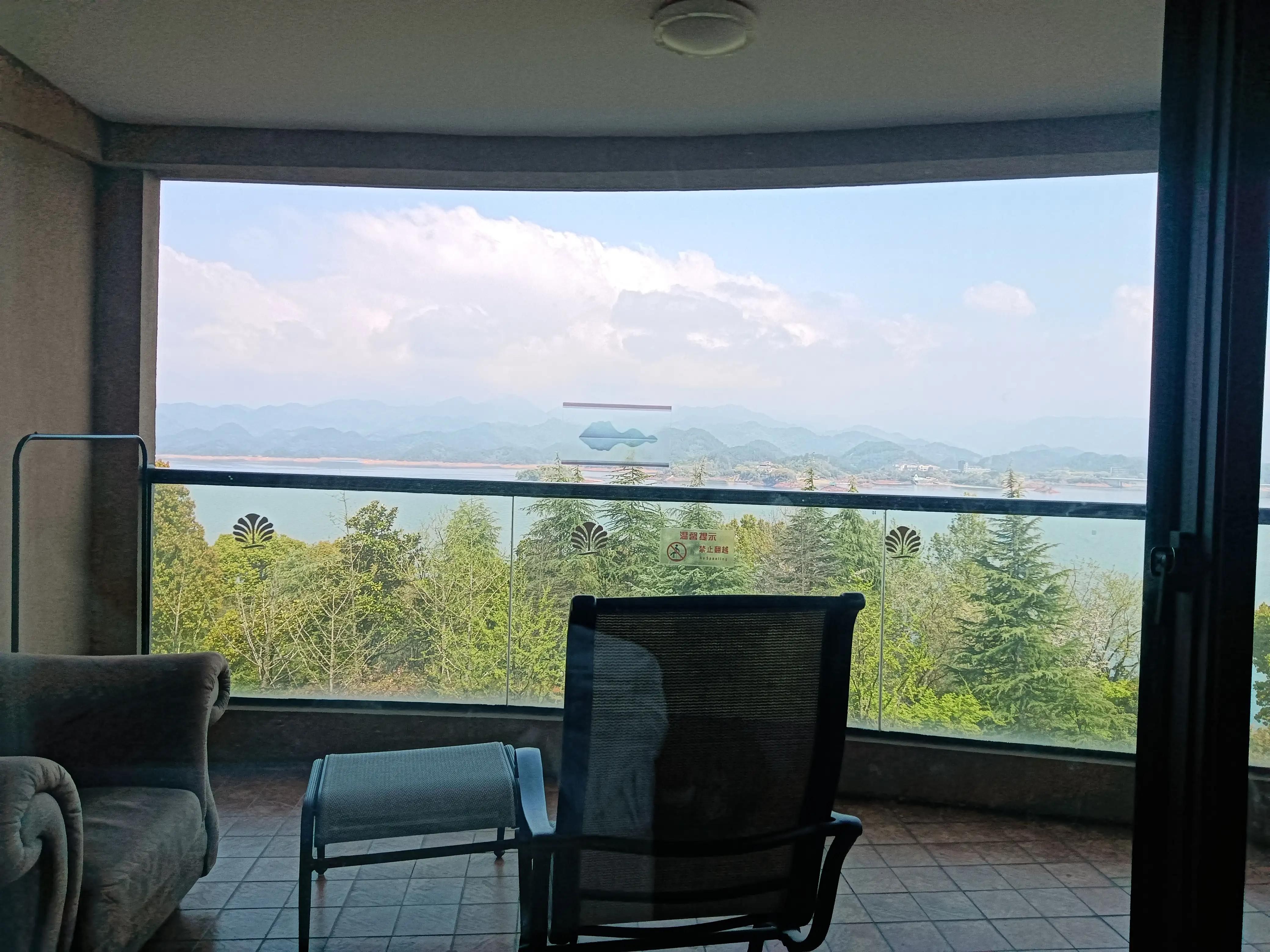 我们按着导航指引到达湖滨的一个公寓式酒店,由于是淡季,加上阴雨天气的原因,酒店入住率不高,稍显冷清。很快办理好了一天的湖景房手续,标间房里有个很大的阳台,楼下设有免费停车场 ,最大的亮点是那面全湖景落地窗,正对千岛湖面,设施配置和房间位置还不错,房费180元的价格也能接受。如果是周末或节假日类似标准的湖景房房费可高达1800元一晚,而且还一房难求。对于自由职业者和退休人员来说错峰出行很重要,面对同样的景点,不仅消费性价比超高,旅游体验感简真不要太好。