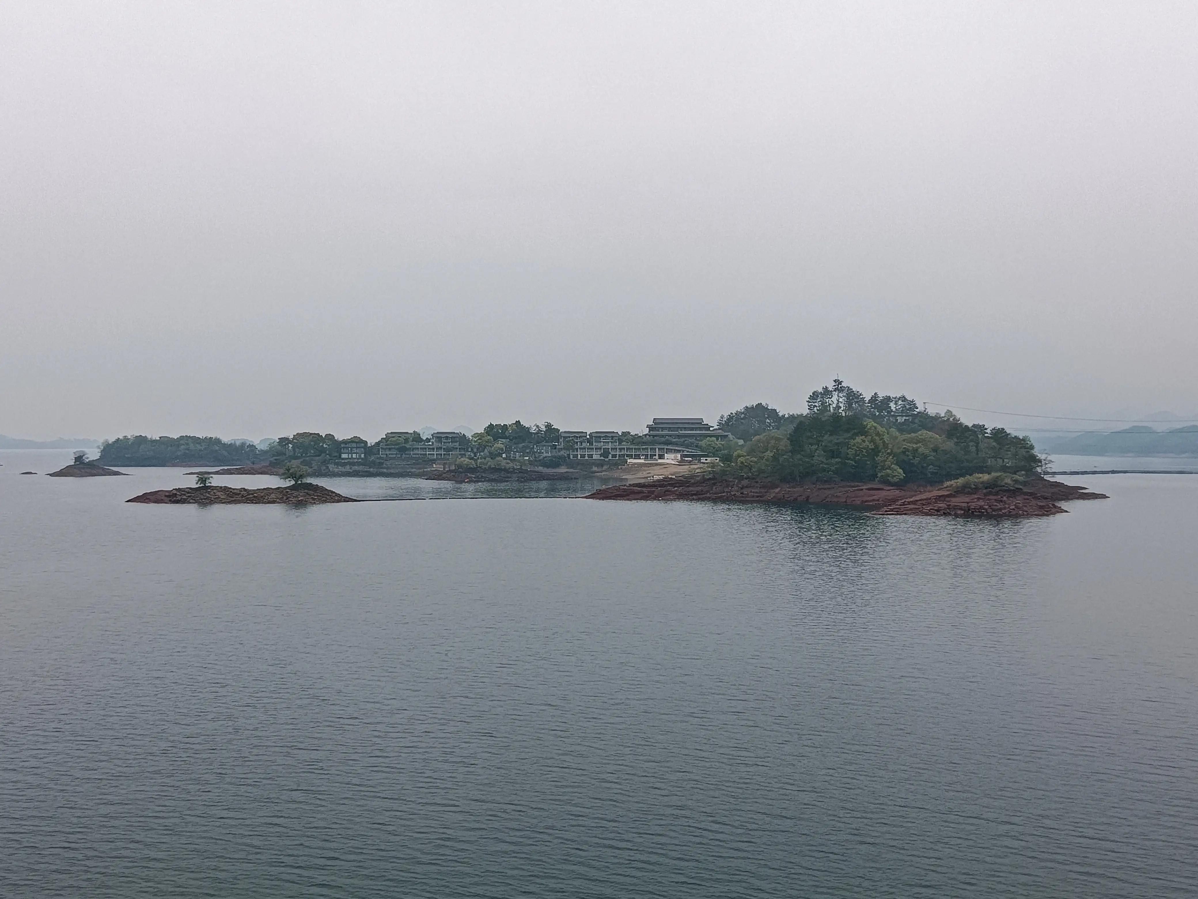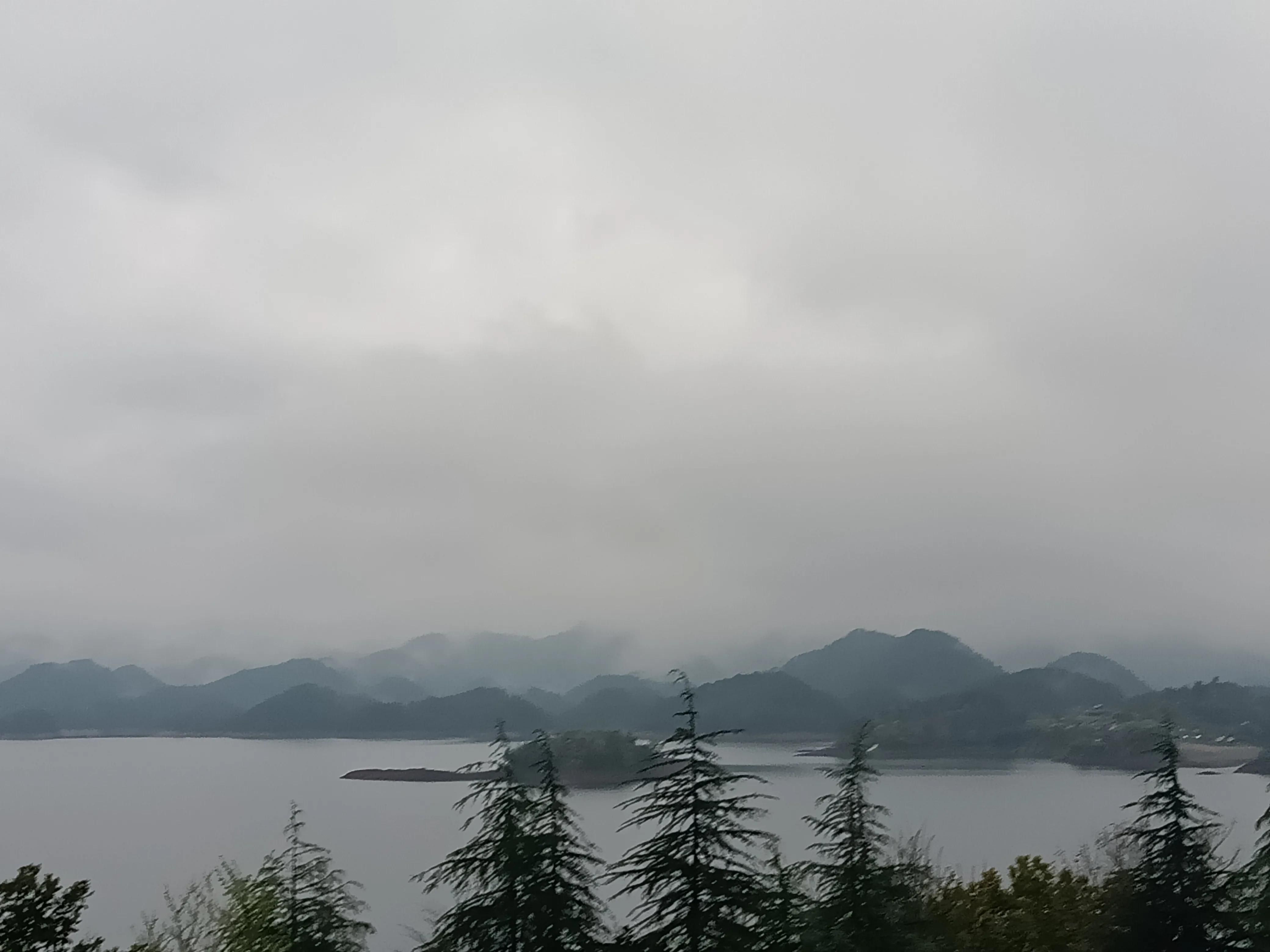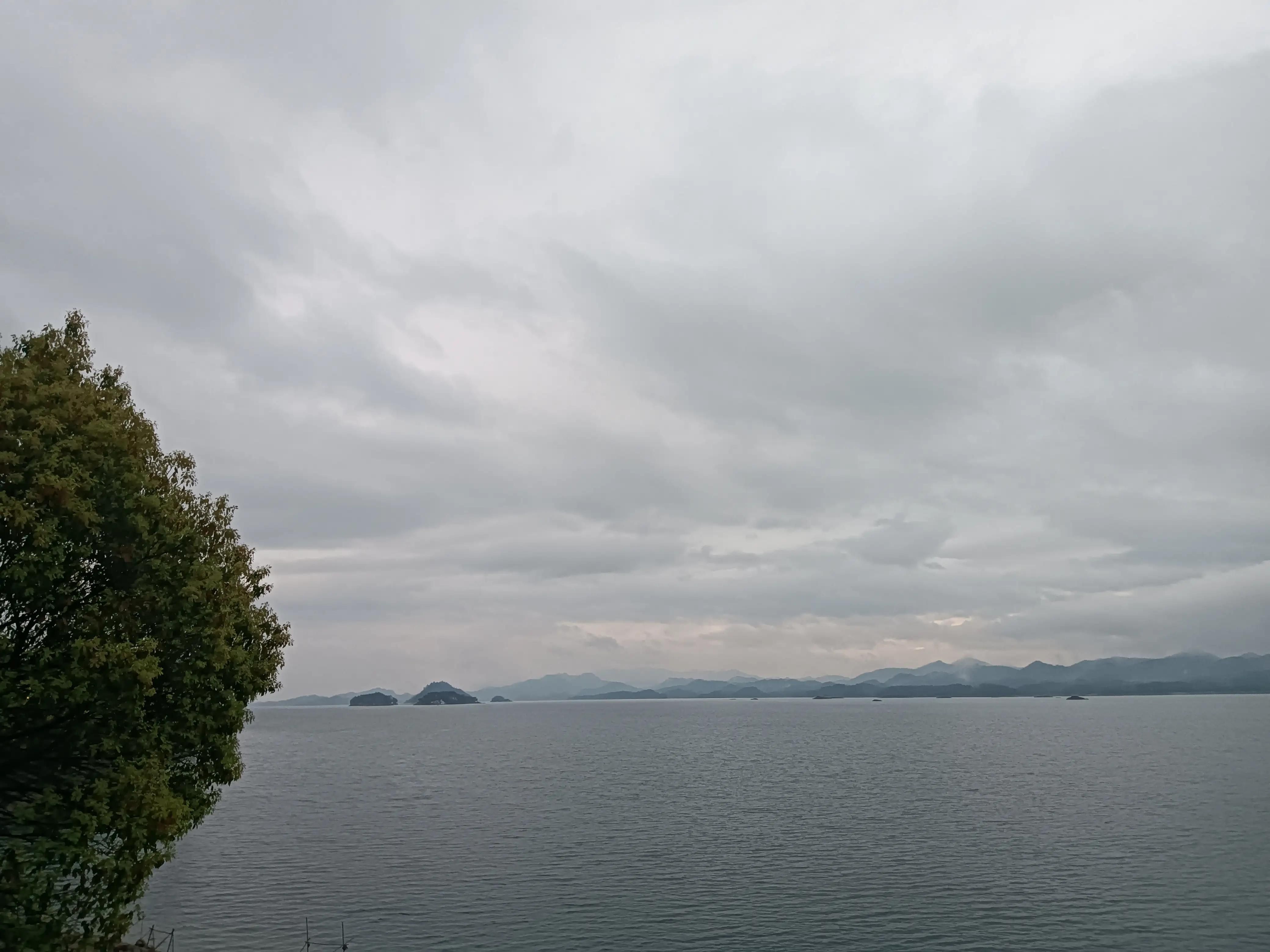 雨中千岛湖犹如水墨画卷,湖面平静、宽阔无边;山峦朦胧娴静、若隐若现;天空中偶尔飞过的鸥鸟,给静态的画卷增添了灵动与想象的空间。就这样默默凝视着千岛湖,千岛湖也没有离开我们的视线。