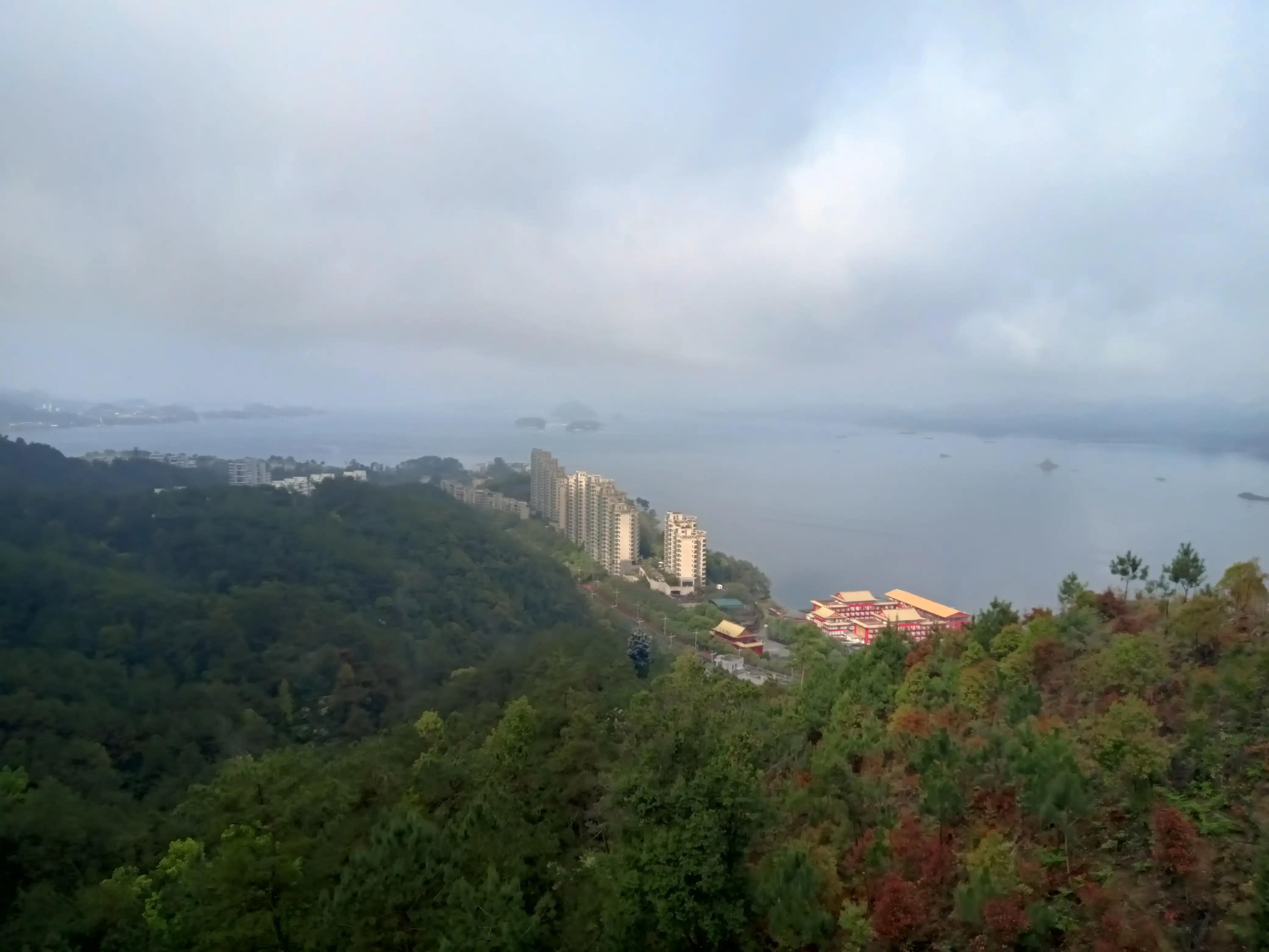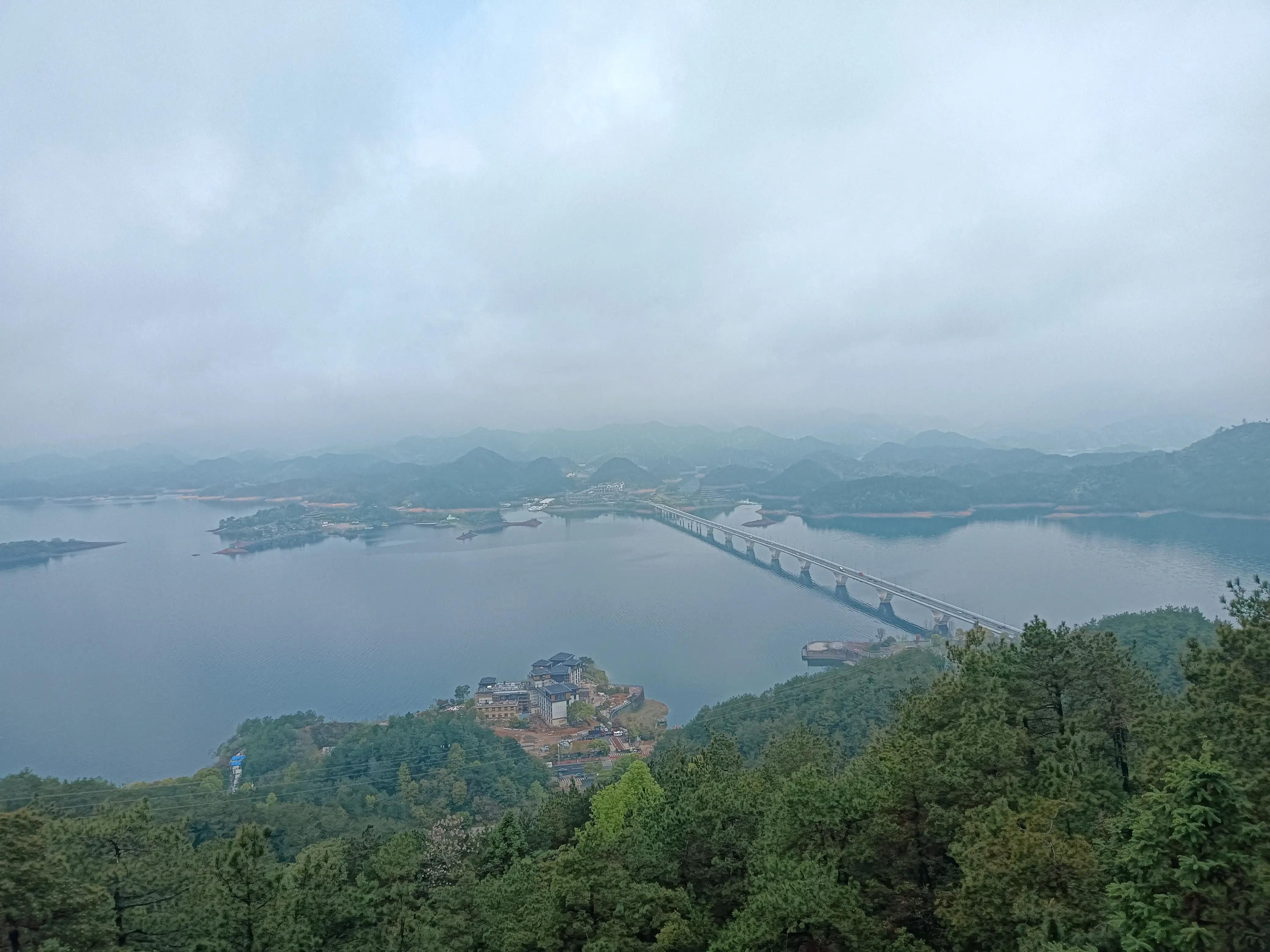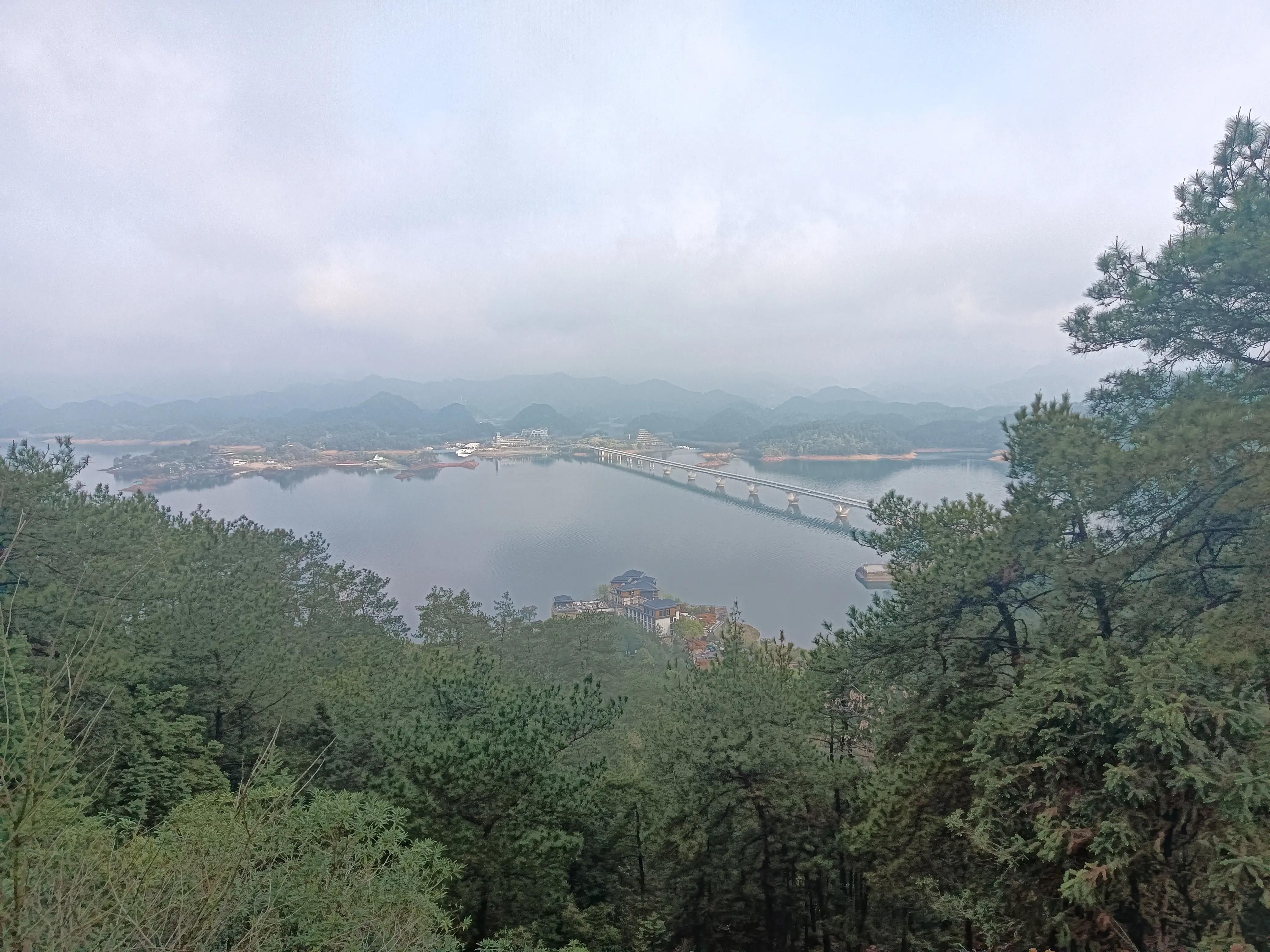 第二天云开雾散,终于要放晴,计划登上天屿观景台,这里是景区制高点,也是来千岛湖必须要去的地方,就在入驻宾馆的旁边。天屿山海拔335米,是俯瞰千岛湖全景和欣赏日落的最佳之地,千岛湖大桥就在山脚下,如同一条玉龙飞腾在碧波之上,群山之间。