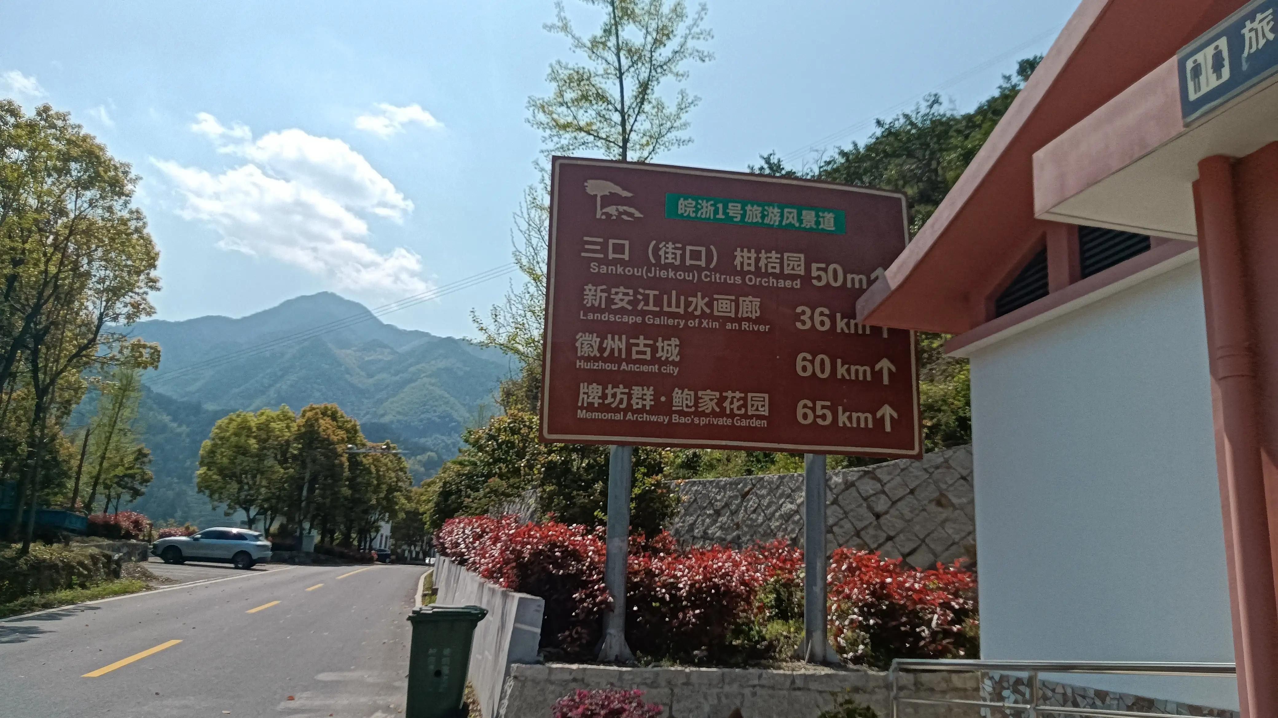 当车行到街口时,意味着已进入安徽境内,皖浙一号公路的宣传标识立于公路两边,景致更显原生态,一切变得亲切起来,回家的感觉真好。到了这里我们稍作休整后,便离开新安江主线,开往大山更深处的石潭村。