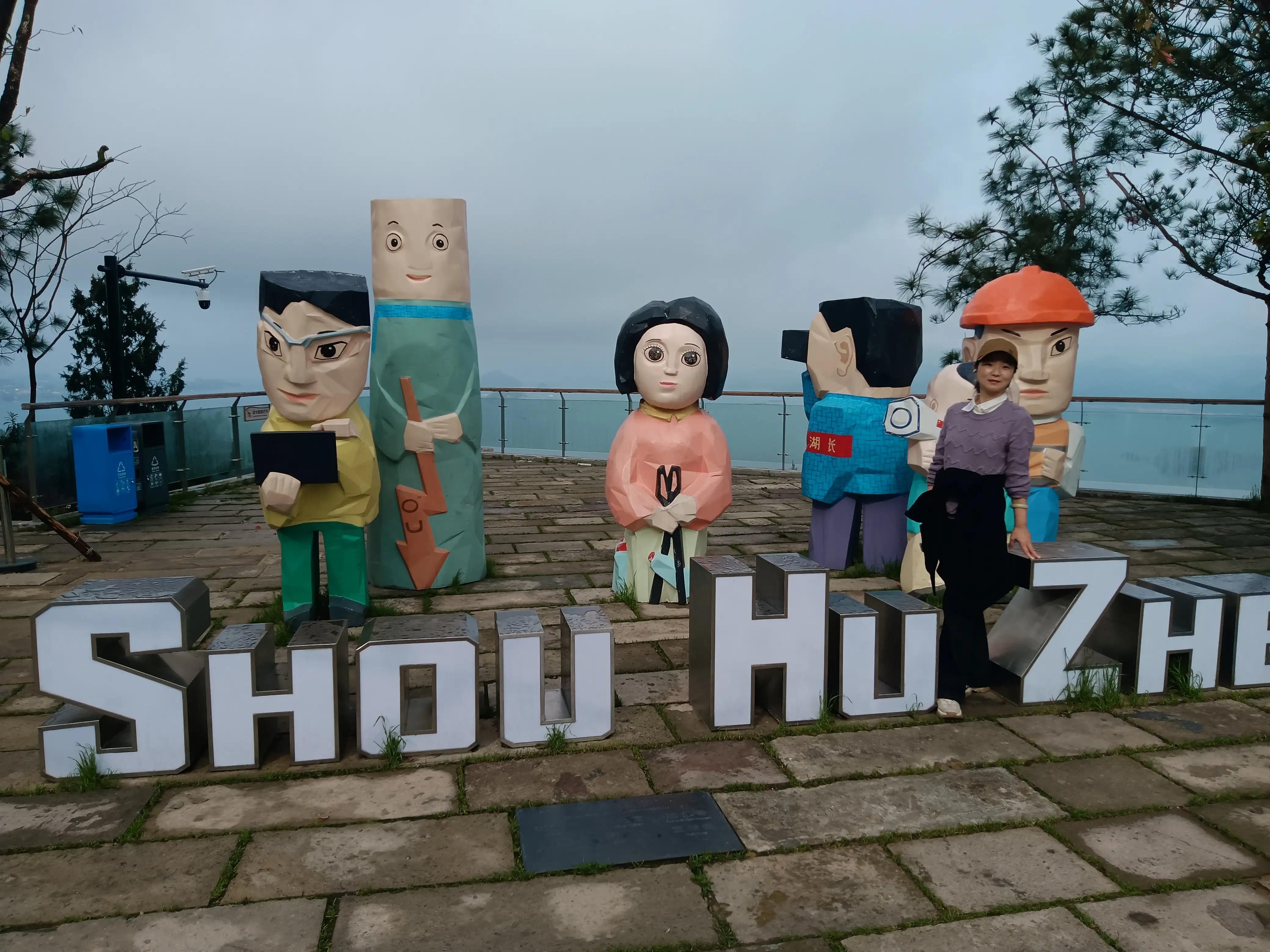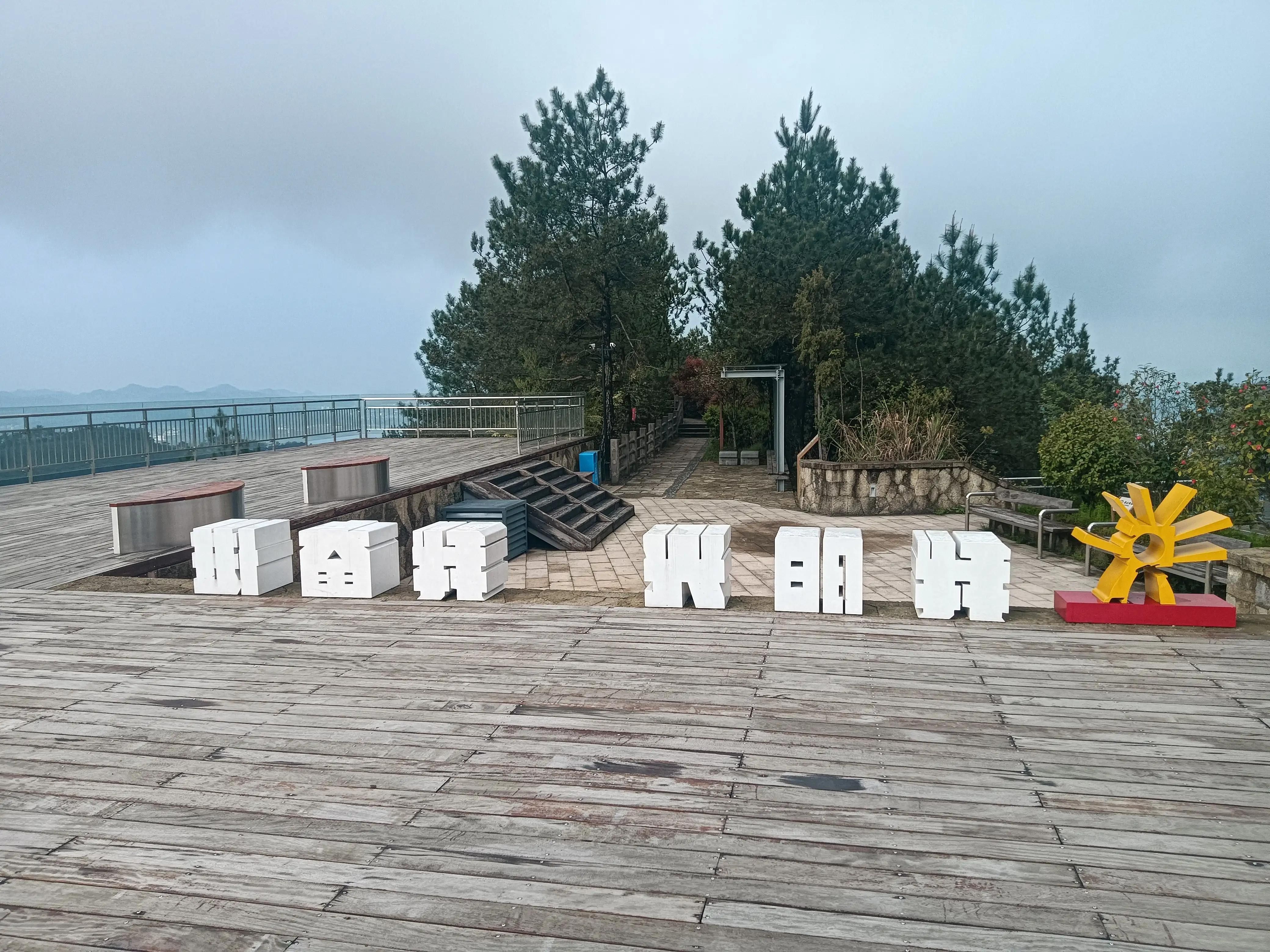 除了观景以外,山上还设有餐饮茶舍,以及颇具文艺范的宣传文字与造型。山顶活动空间不大,可游览项目不多,我们短暂停留后便可抄小路捷径走到山下,路过一处加油站后回到宾馆。