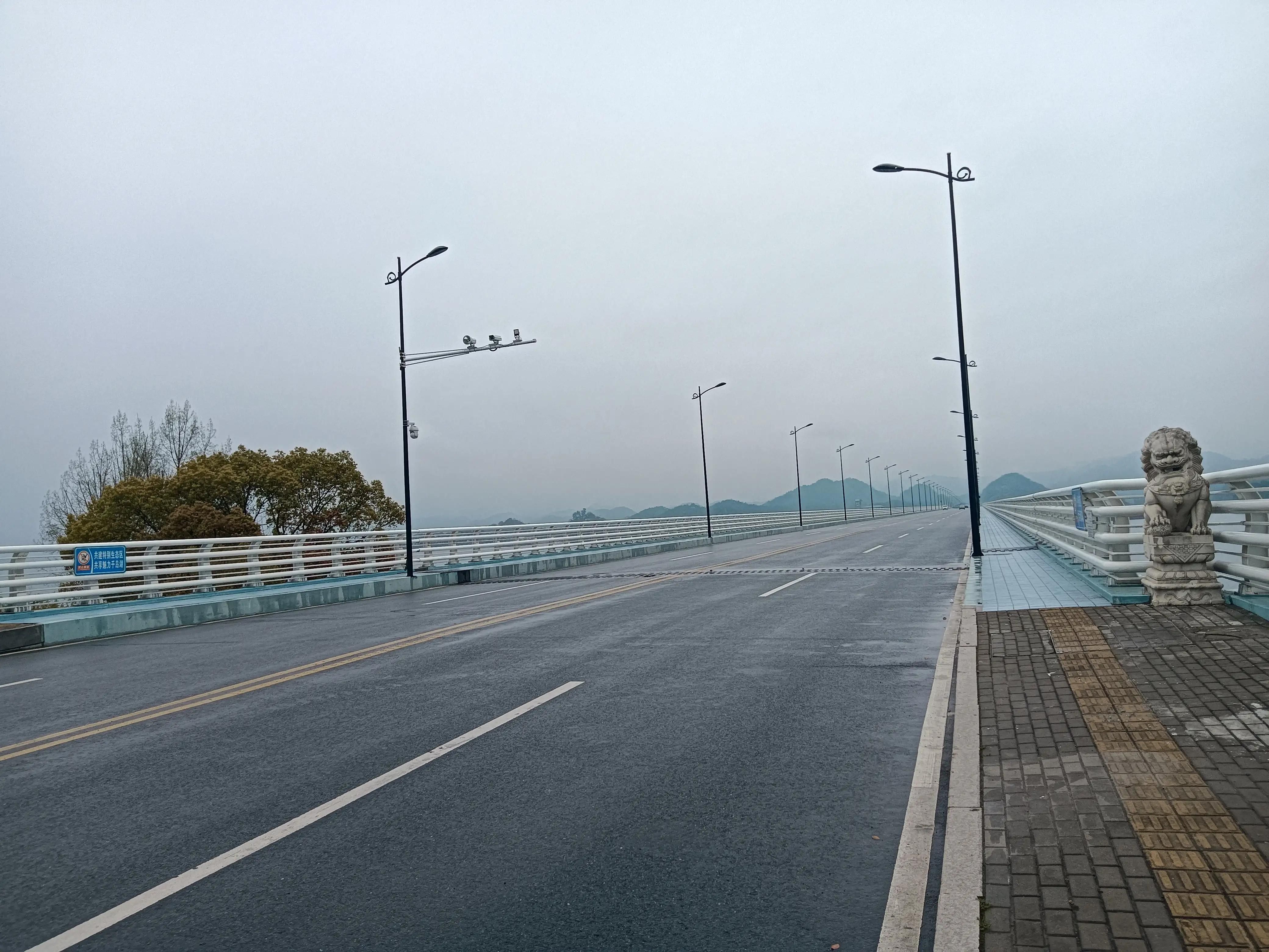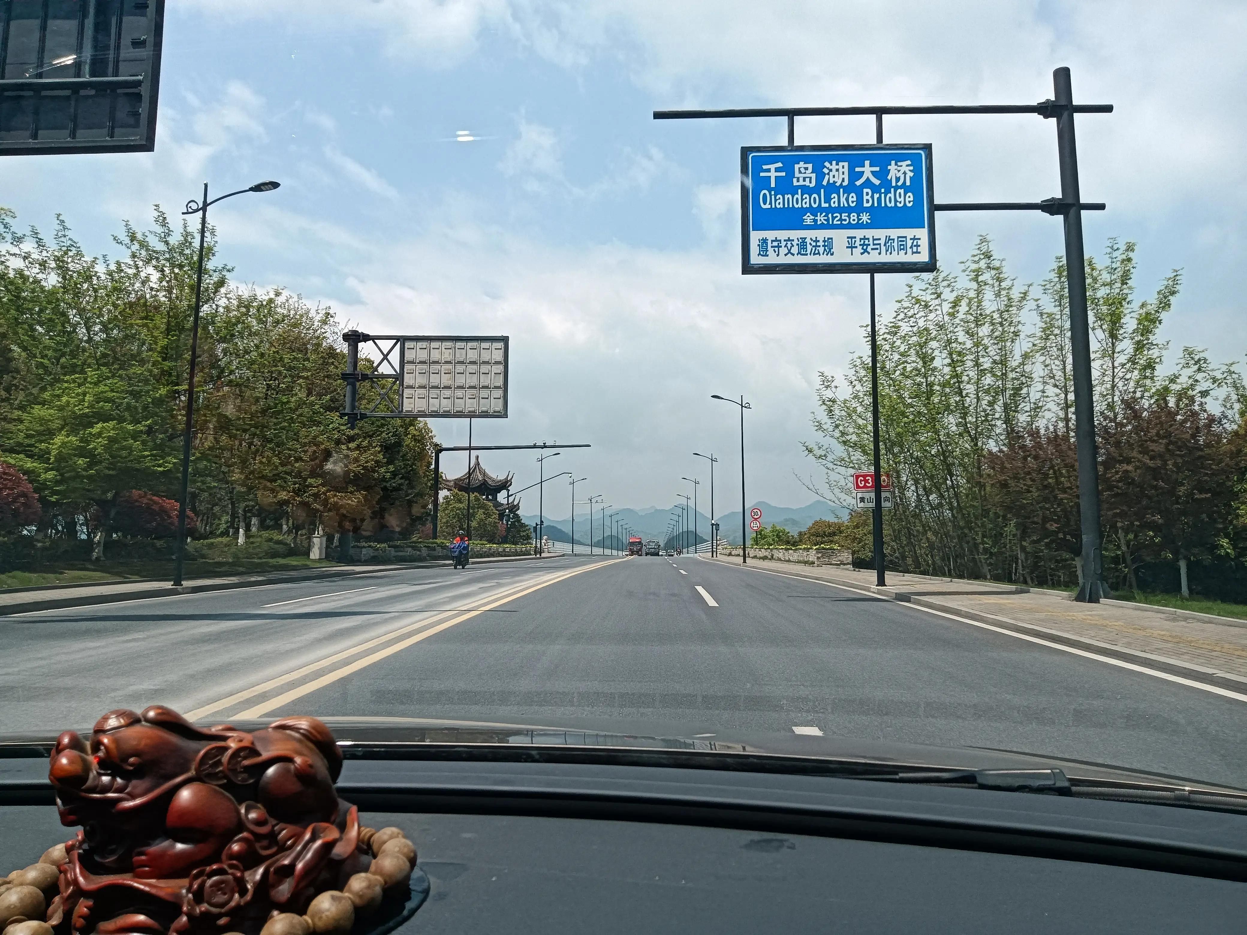 很快就下了高速,安徽和浙江一衣带水,本应是如此之近,以前是那样的远。经过一小段维修的路程,就来到了千岛湖大桥,这应当是进入千岛湖核心景区的标志,千岛湖全长1258米,西起阳光路,上跨千岛湖水道,东至集贤路,是连接浙江与安徽的过湖通道,结构明快、气势宏伟,两边湖水碧绿平静,群岛星罗棋布,视野开阔。