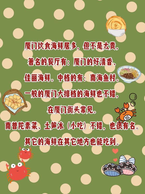 厦门饮食海鲜居多,但不是太贵,著名的餐厅有:厦门的好清香、佳丽海鲜。中档的有:南海鱼村。一般的厦门大排档的海鲜也不错,在厦门街头常见。著名的菜我个人认为:南普陀素菜、土笋冰(小吃)不错,也很有名。其它的海鲜在其它地方也能吃到。