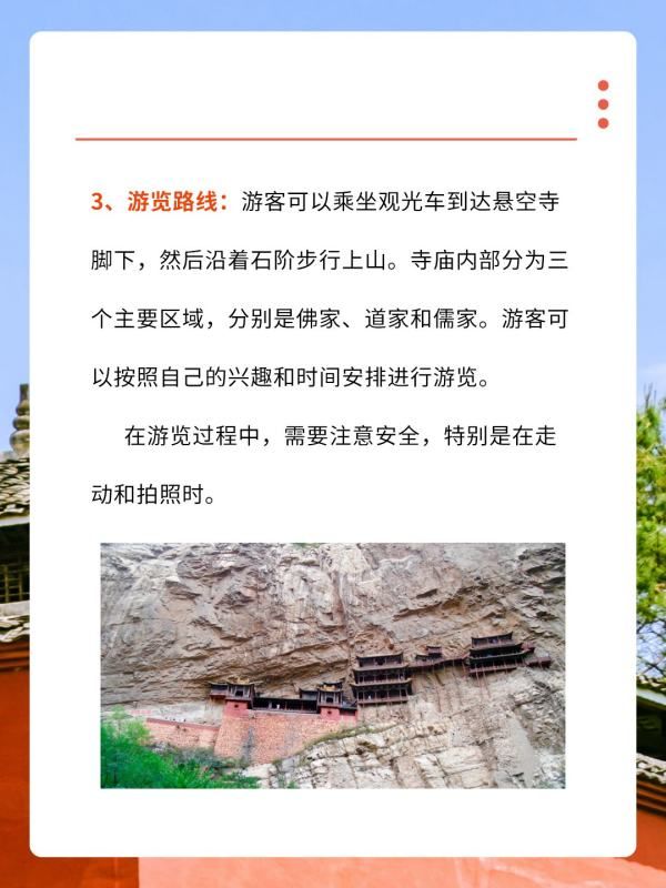 3、游览路线:游客可以乘坐观光车到达悬空寺脚下,然后沿着石阶步行上山。寺庙内部分为三