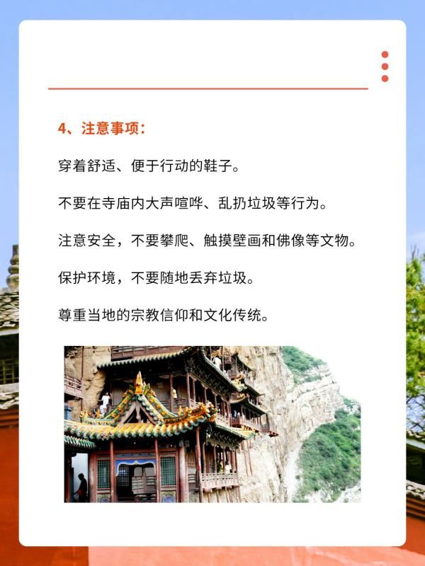 穿着舒适:由于悬空寺位于高山之上,建议穿着舒适的鞋子和衣物。
