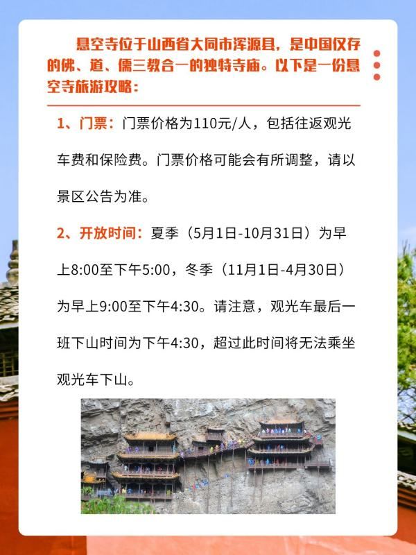 悬空寺位于山西省大同市浑源县,是中国仅存的佛、道、儒三教合一的独特寺庙。以下是一份息空寺旅游攻略: