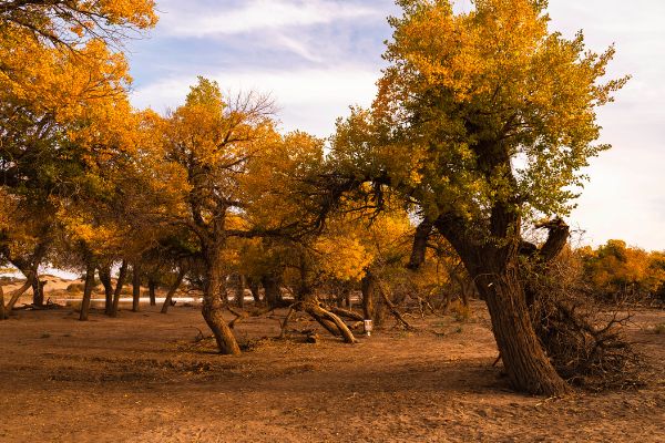 胡杨是新疆荒漠和沙地上唯一能天然成林的树种,主要分布在塔克拉玛干沙漠周围,以塔里木河、叶尔羌河和和田河两岸以及塔里木盆地南缘许多河流的下游最为集中,形成千里“绿色走廊”。