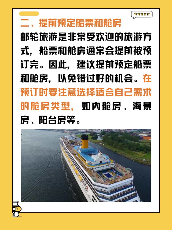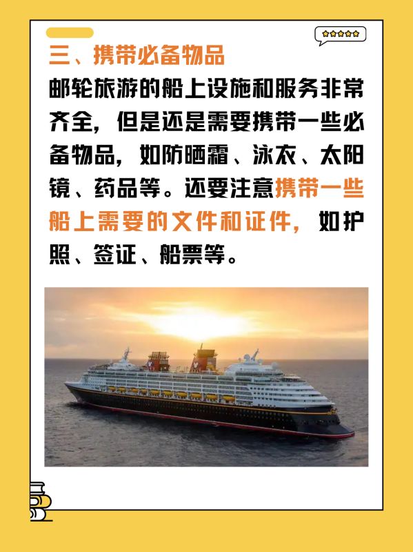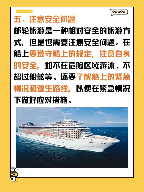 2、安全措施:在邮轮上,安全是最重要的。请遵守邮轮公司的所有安全规定,包括了解紧急出口的位置和使用方法,不要在船上吸烟或使用未经允许的火源等。另外,如果邮轮在夜间经过陌生水域,请确保您已经知道了邮轮的下一个目的地和预计到达时间。