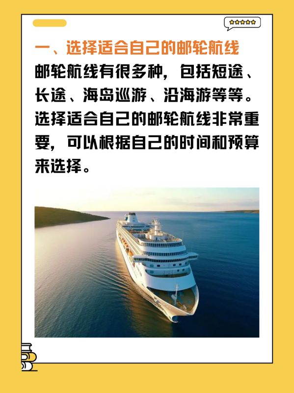 选择适合自己的邮轮航线,可以根据自己的时间和预算来选择。
