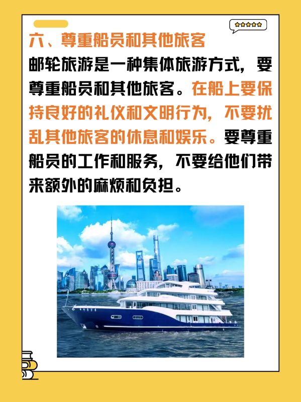 4、社交礼仪:在邮轮上,您需要遵守社交礼仪。请尊重其他游客的私人空间和文化习惯,避免在公共场所大声喧哗或制造噪音,避免在船上穿着过于暴露或过于暴露的衣服等。