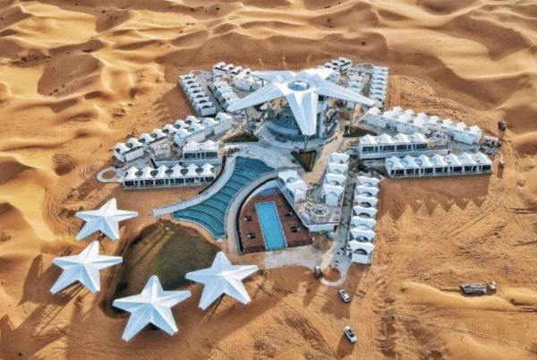 3、沙漠星星酒店:沙漠星星酒店是国内首个以沙漠观星为主题的酒店,它坐落在宁夏中卫沙坡头旅游景区内,以五角星形状规划设计,从空中俯瞰正形如一颗颗星星。远远看到的第一个建筑则是一个巨大无比、白色的半球体,这是酒店的标志性建筑星星剧场的穹顶。