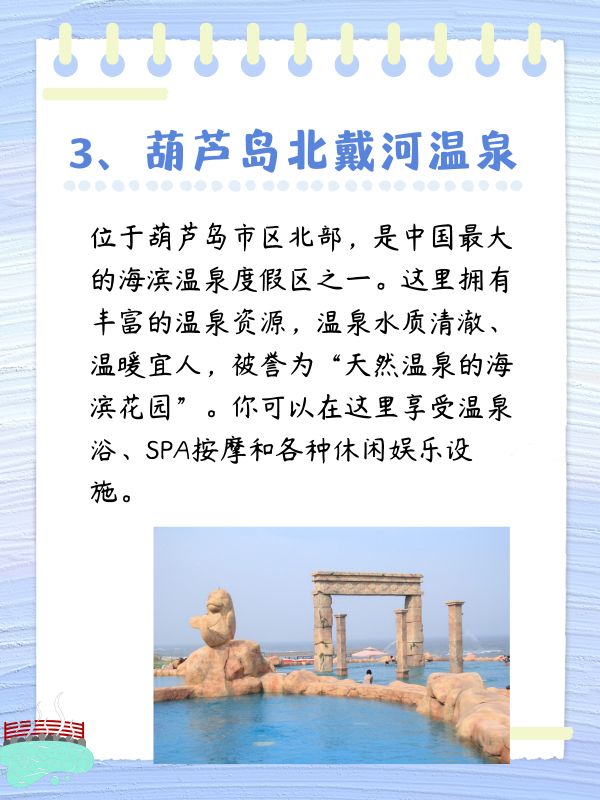位于葫芦岛市区北部,是中国最大的海滨温泉度假区之一。这里拥有丰富的温泉资源,温泉水质清澈、温暖宜人,被誉为“天然温泉的海滨花园”。你可以在这里享受温泉浴、SPA按摩和各种休闲娱乐设施。