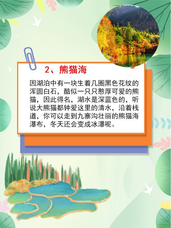 因湖泊中有一块生着几圈黑色花纹的浑圆白石,酷似一只只憨厚可爱的熊猫,因此得名,湖水是深蓝色的,听说大熊猫都钟爱这里的清水,沿着栈道,你可以走到九寨沟壮丽的熊猫海瀑布,冬天还会变成冰瀑呢。