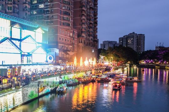 岐江夜游,全长约6公里,江河两岸绿树成荫,岸堤整洁,点缀着许多城市雕塑。沿江有景观路、广场和公园,商铺成排,酒店林立,既有知名的孙文西路文化旅游步行街、中恳广场等大型商场,还有环境优美的大信花园以及河畔小公园等。