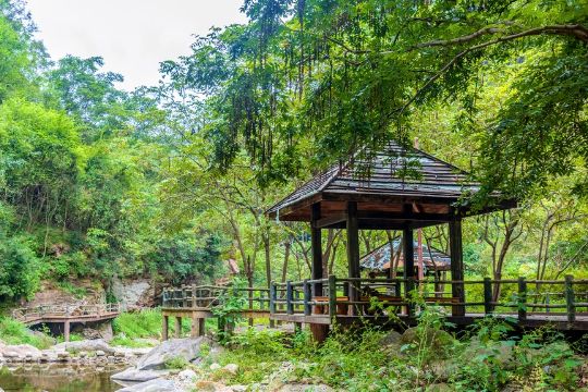 逍遥谷得天独厚的是依托了粤东南沿海的重要山脉、三百平方公里的五桂山。五桂山系北宽26公里,南宽15公里,主峰海拔541.6米,属花岗岩地貌,南坡五公里长的断层崖雄伟险峻,北坡山脉青翠绵延起伏。