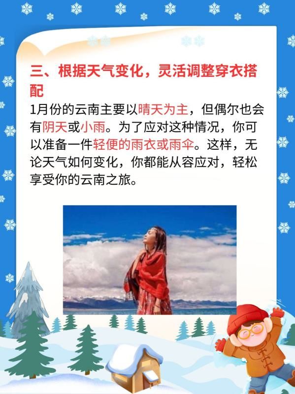 最后,1月份的云南天气变化无常,所以准备一件轻便的雨衣或雨伞是很有必要的。这样,无论天气如何变化,你都能从容应对,轻松享受你的云南之旅。