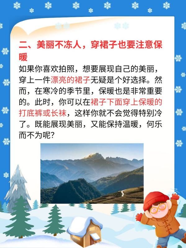 其次,如果你喜欢拍照,想要展现自己的美丽,穿上一件漂亮的裙子是个不错的选择。但是,别忘了在裙子下面穿上保暖的打底裤或长袜,这样你就不会觉得特别冷了。