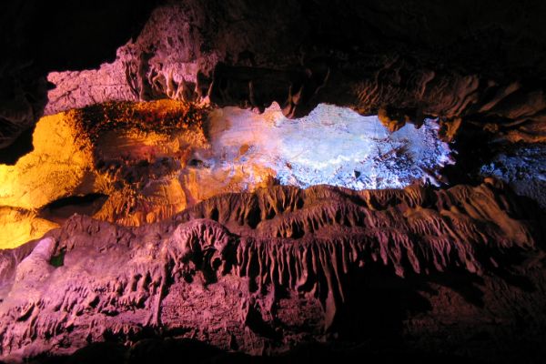 开元溶洞是因洞内有唐、开元年间的摩崖石刻而得名,洞内大而高,长1100余米,分六个大厅,洞内各种石钟乳等自然景物玲珑剔透,形象逼真,令人目不暇接。越往洞内行走,脚下的石板越湿滑,道路越曲折蜿蜒,景色更迷人壮观。头顶上滴落的水珠时不时击打在石板上,悦耳动听。