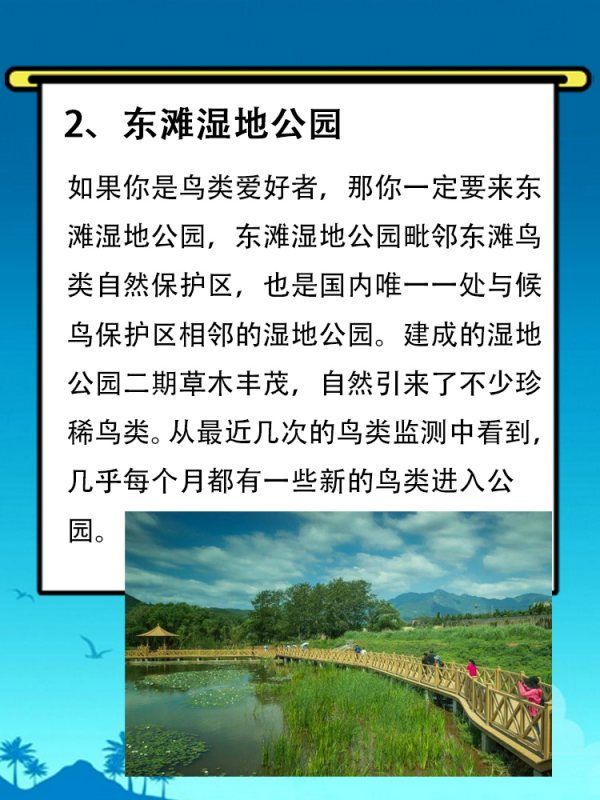 东滩湿地公园:这里是观鸟的好地方,有着丰富的生物多样性。春秋季节,成千上万的候鸟在此迁徙停歇,非常适合摄影爱好者。