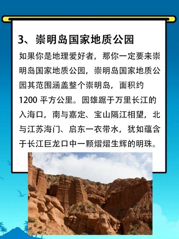 崇明岛国家地质公园:可以了解岛屿成岛过程及自然地理现象,适合带小朋友去增长知识。