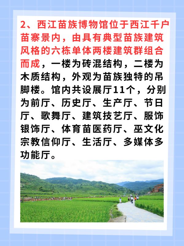 2、西江苗族博物馆位于西江千户苗寨景内,由具有典型苗族建筑风格的六栋单体两楼建筑群组合而成,一楼为砖混结构,二楼为木质结构,外观为苗族独特的吊脚楼。