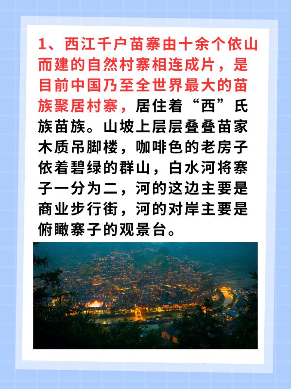 西江千户苗寨是中国最大的苗族聚居村寨,位于贵州省黔东南苗族侗族自治州雷山县东北部的西江镇。这里是一个保存苗族“原始生态”文化完整的地方,也是目前中国乃至全世界最大的苗族聚居村寨。如果你计划去西江千户苗寨旅行,以下是一些需要注意的事项:
