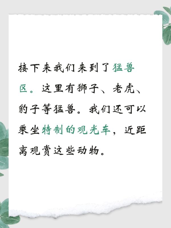 接下来我们来到了猛兽区。这里有狮子、老虎、豹子等猛兽。我们还可以乘坐特制的观光车,近距离观赏这些动物。真是太震撼了!