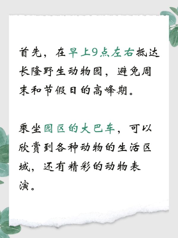 首先,我们选择在早上9点左右抵达长隆野生动物园,避免周末和节假日的高峰期。乘坐园区的大巴车,可以欣赏到各种动物的生活区域,还有精彩的动物表演。大巴车座位有限,先到先得哦!