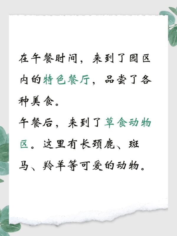 午餐后,我们来到了草食动物区。这里有长颈鹿、斑马、羚羊等可爱的动物。我们还乘坐了园区的小火车,穿越了整个草食动物区,真是太刺激了!