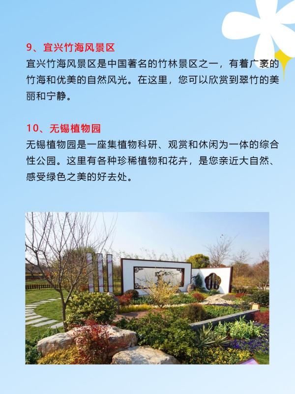 无锡植物园是一座集植物科研、观赏和休闲为一体的综合性公园。这里有各种珍稀植物和花卉,是您亲近大自然、感受绿色之美的好去处。