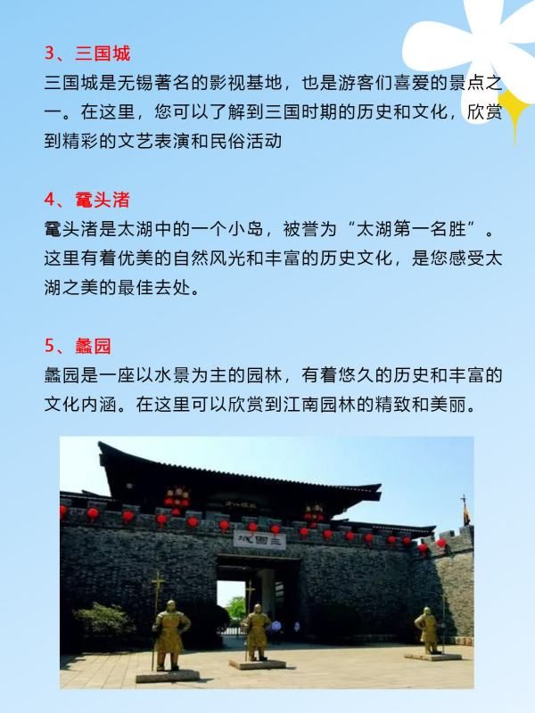 三国城是无锡著名的影视基地,也是游客们喜爱的景点之一。在这里,您可以了解到三国时期的历史和文化,欣赏到精彩的文艺表演和民俗活动。