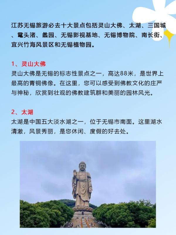 江苏无锡旅游必去十大景点包括灵山大佛、太湖、三国城、鼋头渚、蠡园、无锡影视基地、无锡博物院、南长街、宜兴竹海风景区和无锡植物园。