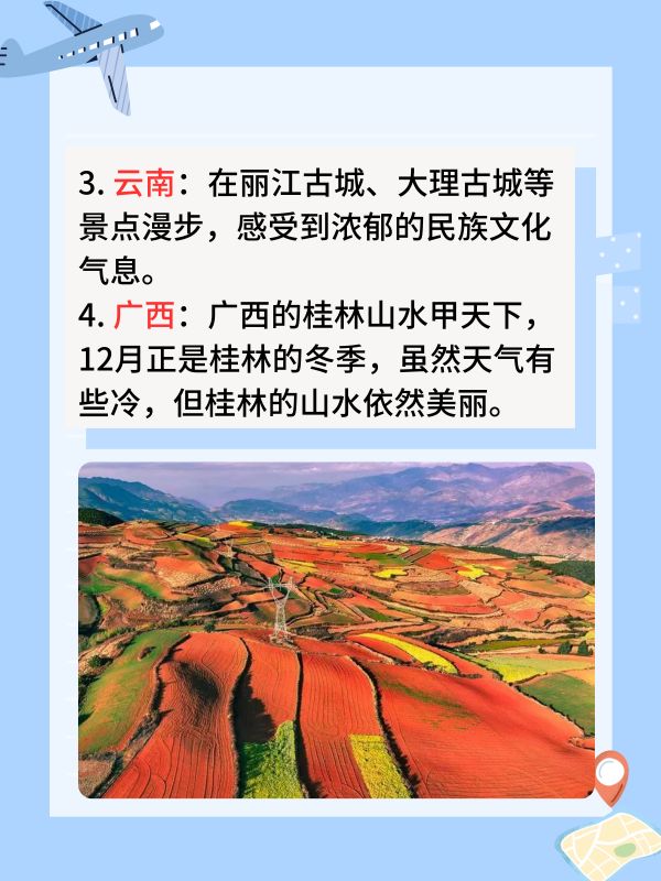 云南是12月份旅游最好的选择。云南的气候适宜,冬天气温适中,冬天的丽江、香格里拉和大理等景点都很美。